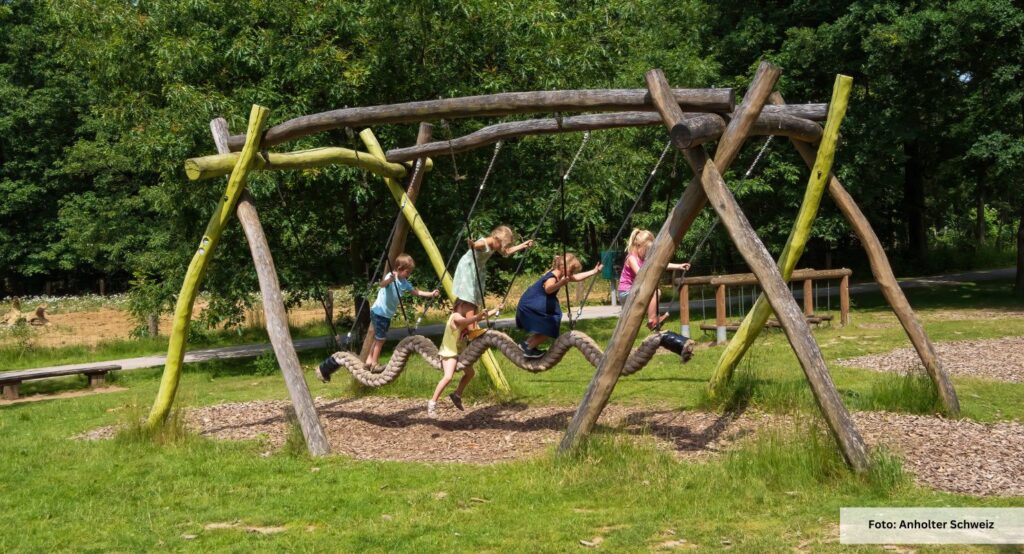 Ein großer Spielplatz lädt zum Spielen und Toben ein – und das mitten in der traumhaften Natur.