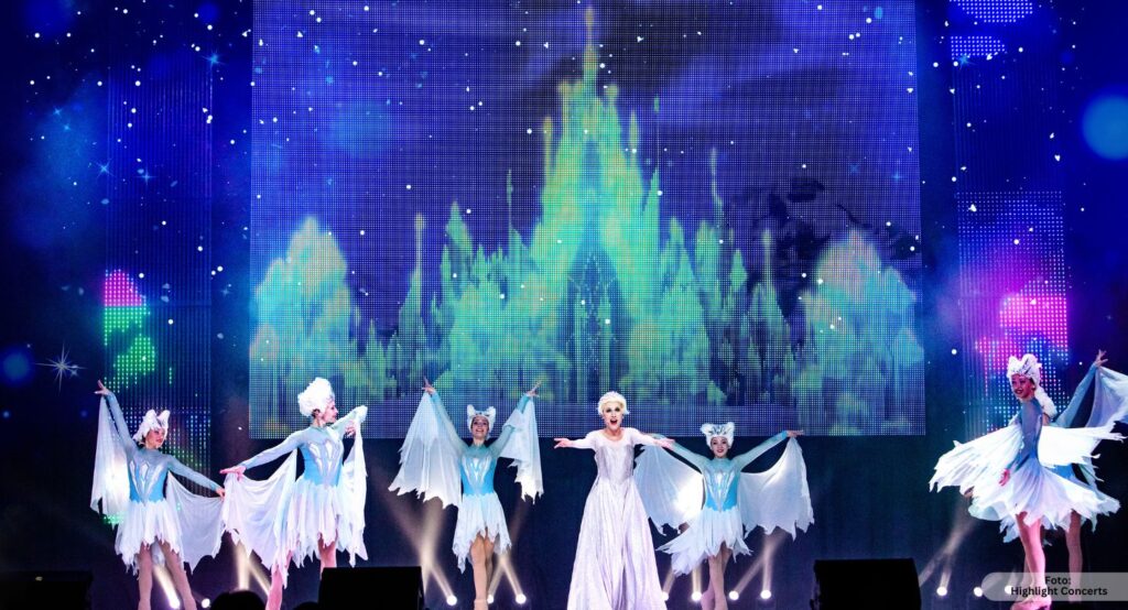 Gänsehaut pur, wenn Elsa den absoluten Hit des Abends „Lass jetzt los!“ singt und dabei die Bühne und die riesige LED-Leinwand mit ihren magischen Kräften in ein Meer aus Eis und tiefblauen Kristallen verzaubert! Lustig, wenn Schneemann Olaf in „Im Sommer“ von Sonne und Strand träumt „mit einem Drink in der Hand und ganz knackig braun!“