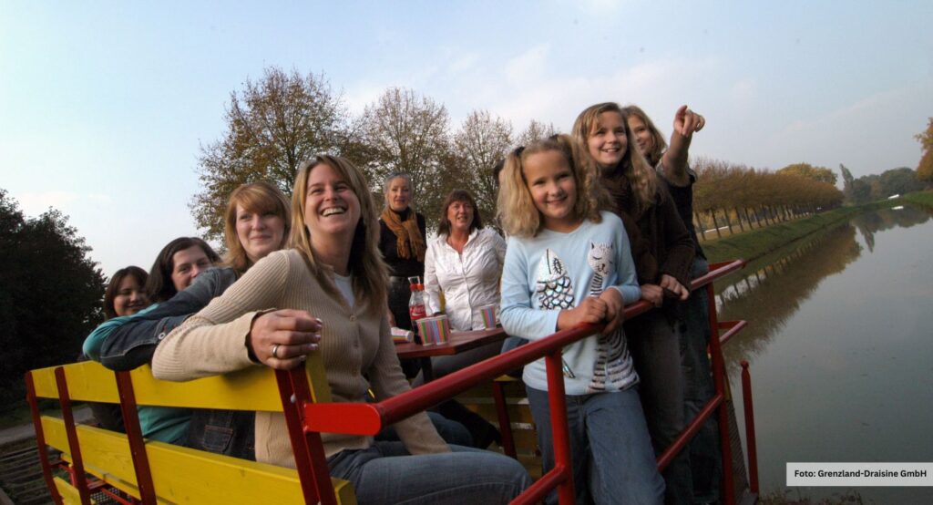 Mit der Grenzland-Draisine kann man auf einer stillgelegten Bahnlinie zwischen Kleve, Kranenburg und dem niederländischen Groesbeek fahren. Dabei wird die Draisine durch eure eigene Muskelkraft ähnlich wie ein Fahrrad angetrieben.